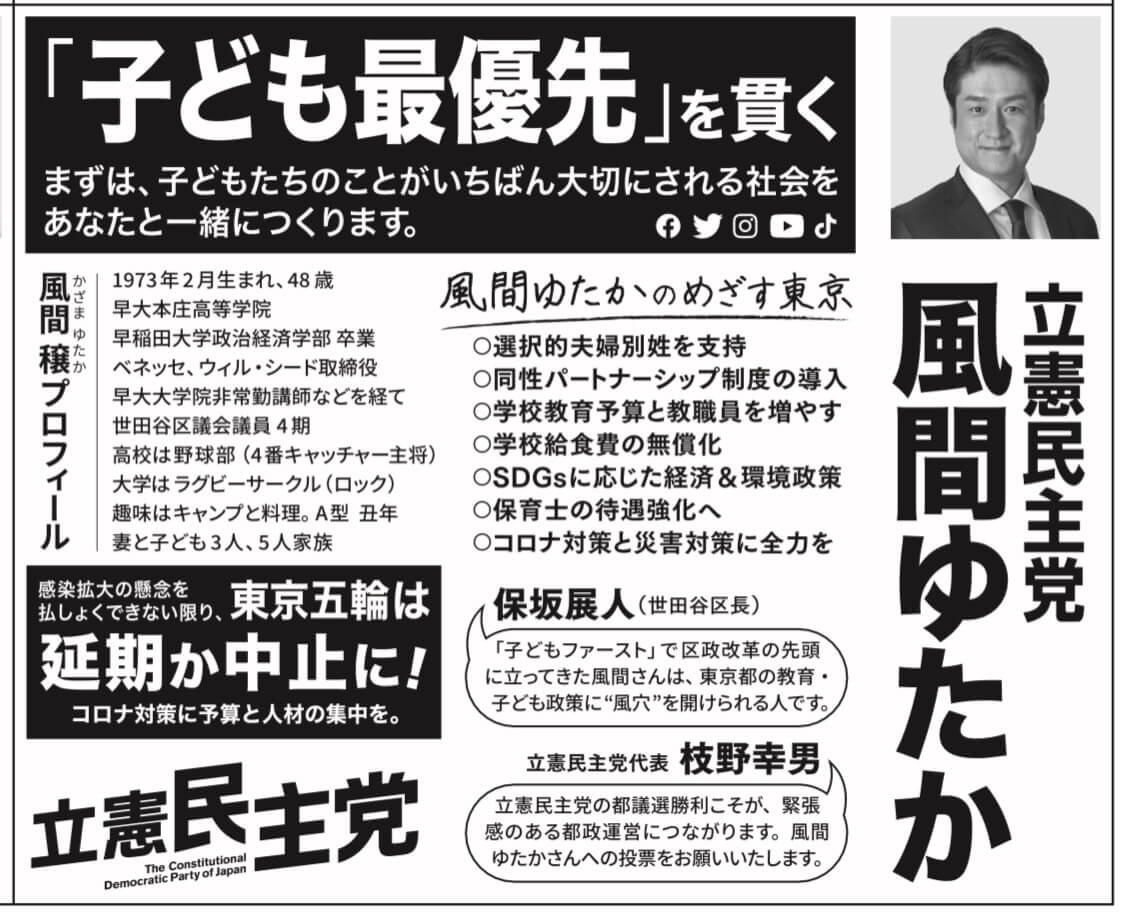 昨日投開票の東京都議会議員選挙で、23849票を頂き当選致しました。https://www.city.setagaya.lg.jp/mokuji/kusei/007/001/d00192297.html なかなか当選確実報道がなされず、選対メンバーもハラハラドキドキしていましたが、日付が変わってからNHKで風間ゆたかの当選確実が報じられました。 ご注目くださった皆様、票を投じてくれた世田谷区の皆様、自分だけではなくお知り合いに風間ゆたかへの投票を呼びかけて下さった皆様、世田谷区民ではないからとお知り合いの世田谷区民に声がけして下さった皆様、少しでも風間ゆたかの事を知ってもらおうとポスティングや街頭活動でのチラシ配布に力を貸してく